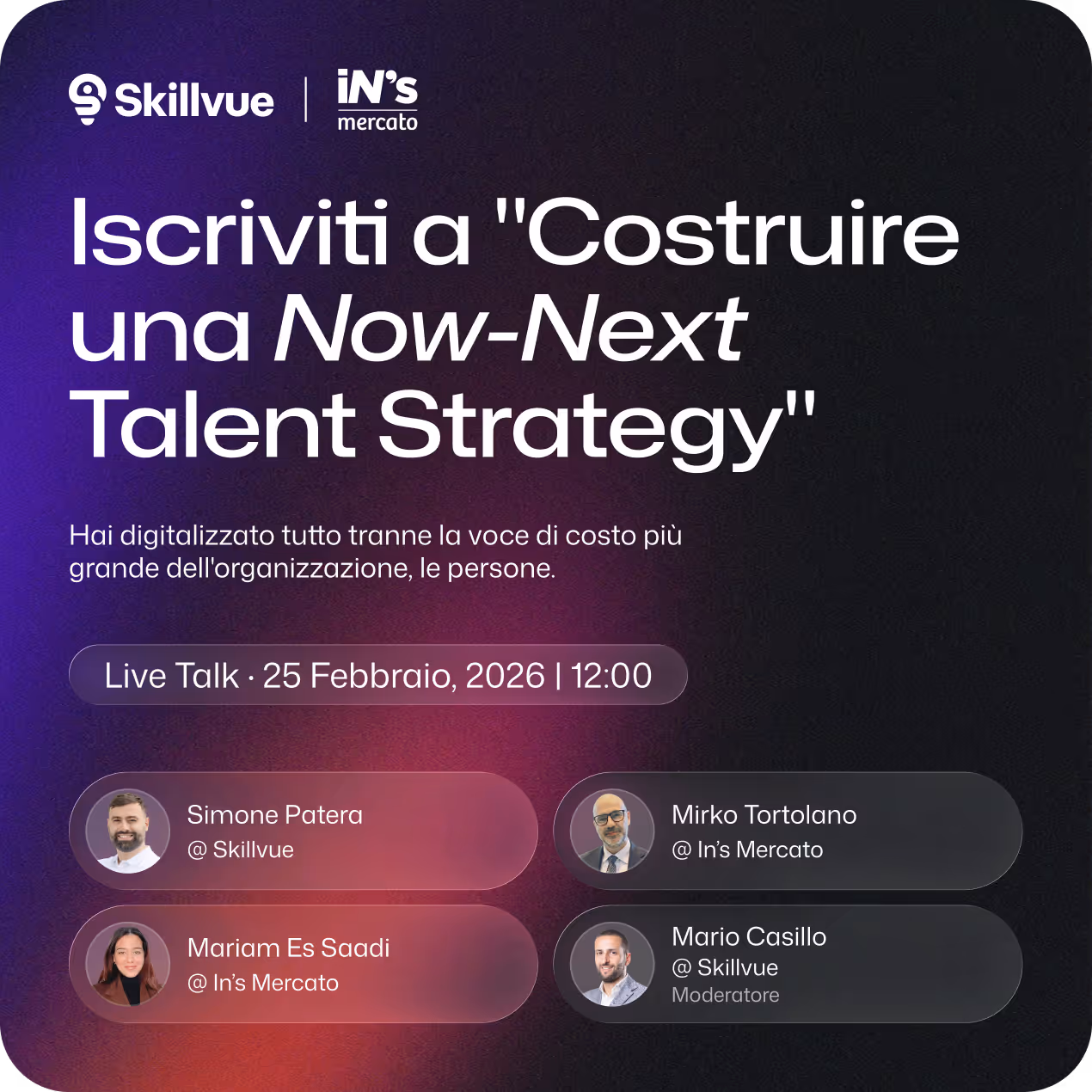 In's Mercato racconterà come ha portato l'AI nelle decisioni sulle persone: dalla valutazione delle competenze soft su larga scala alla strutturazione di dati che prima non esistevano, dalla standardizzazione di ciò che era soggettivo alla produzione di insight predittivi sulla qualità delle persone su tutta la rete di punti vendita. Un caso d'uso AI concreto, con risultati misurabili.
