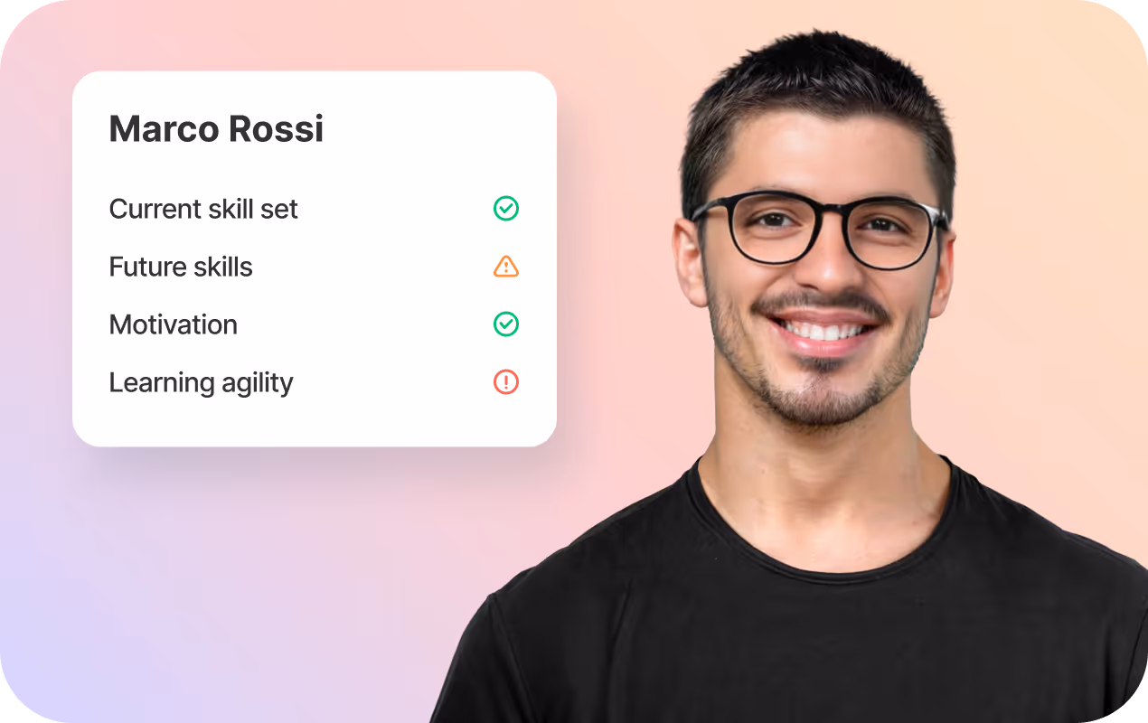 Non fermarti alla valutazione soggettiva del manager o all’autovalutazione del dipendente: valuta l’intero spettro di dati a tua disposizione. In questo modo potrai individuare connessioni chiare tra competenze, skill gap e motivazione di una persona rispetto alle sue performance. Così otterrai spunti d’azione concreti e utili, capaci di guidare un reale miglioramento dei risultati nel tempo.